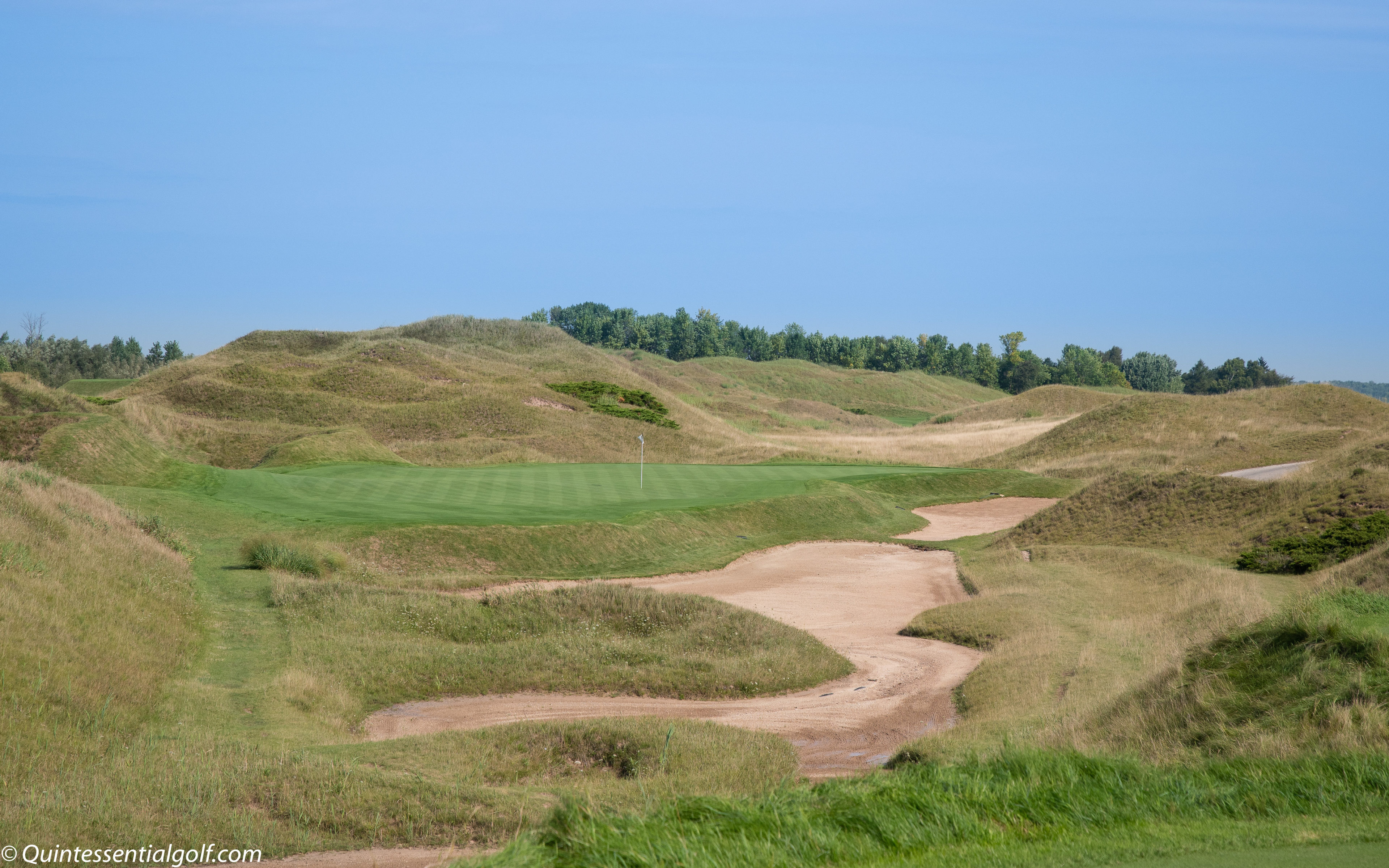 The Irish Course mirrors the look and feel of a traditional seaside links course found in Ireland or Scotland—rolling terrain, deep sod-walled bunkers, vast green complexes, and high native grasses line the fairways. But unlike many American courses that borrow from links architecture, the Irish Course executes it with authenticity. The layout artfully uses the windswept topography just inland from Lake Michigan, flowing naturally with the land.